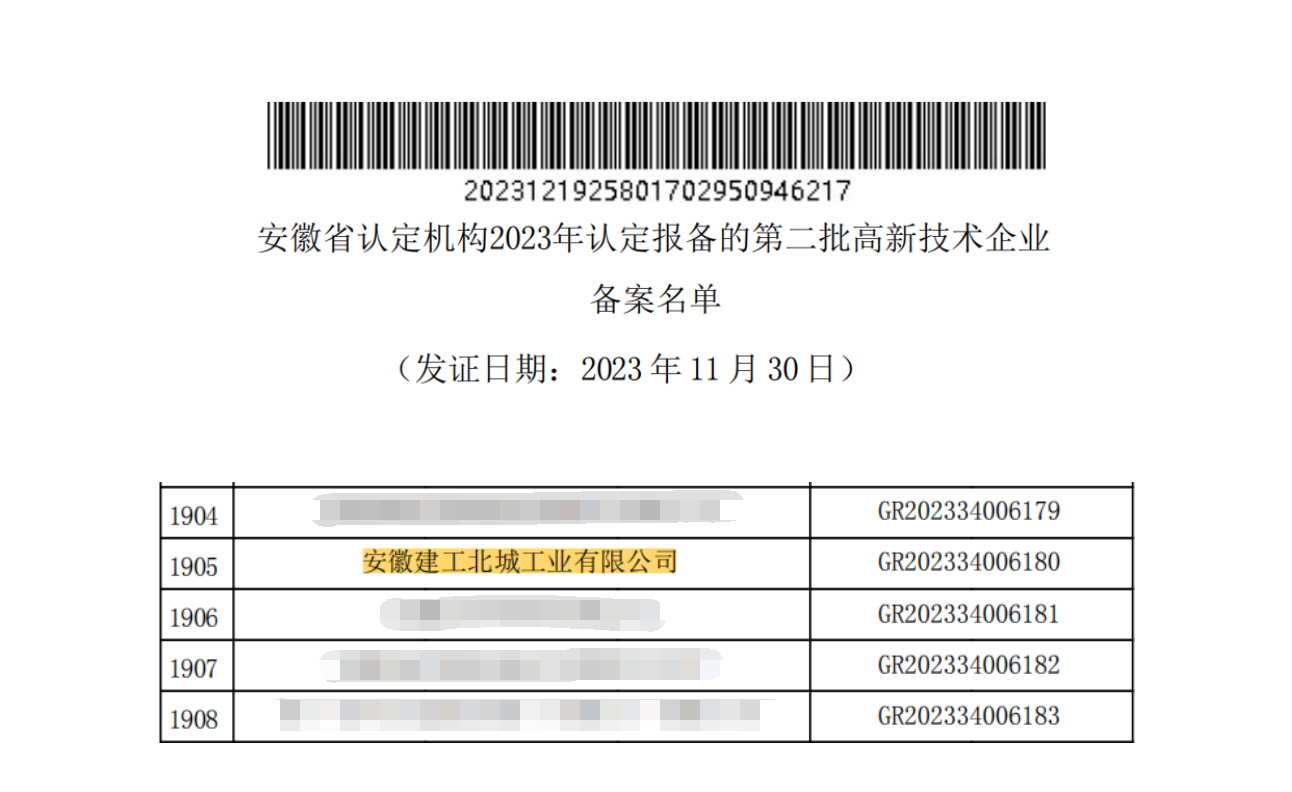 近日,安徽省科技厅、安徽省财政厅、国家税务总局安徽省税务局正式发布《关于公布安徽省2023年第二批高新技术企业认定名单的通知》,认定安徽建工北城工业有限公司为“国家高新技术企业”。另外,公司收到合肥市应急管理局颁布的合肥市“安全生产标准化三级企业”荣誉证书。