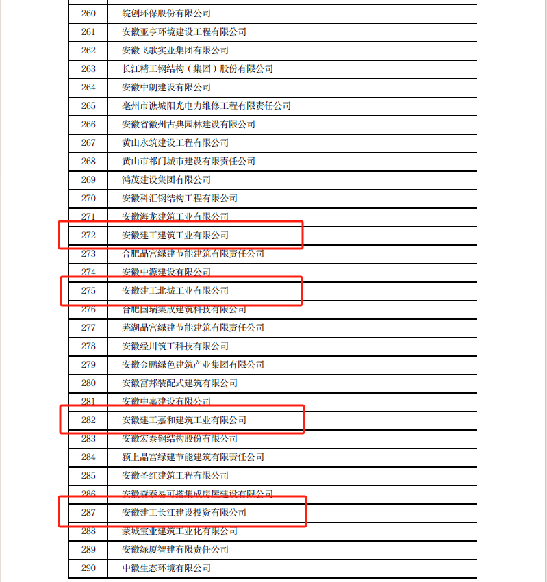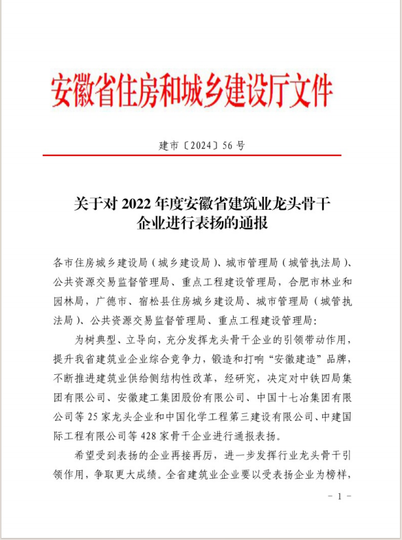 近日,安徽省住房和城乡建设厅对2022年度安徽省建筑业龙头企业和428家骨干企业发文通报表扬,建工工业化集团四家所属单位,建筑工业公司、北城工业公司、嘉和工业公司、长江建投公司获此殊荣。