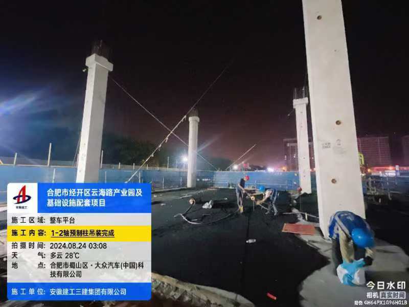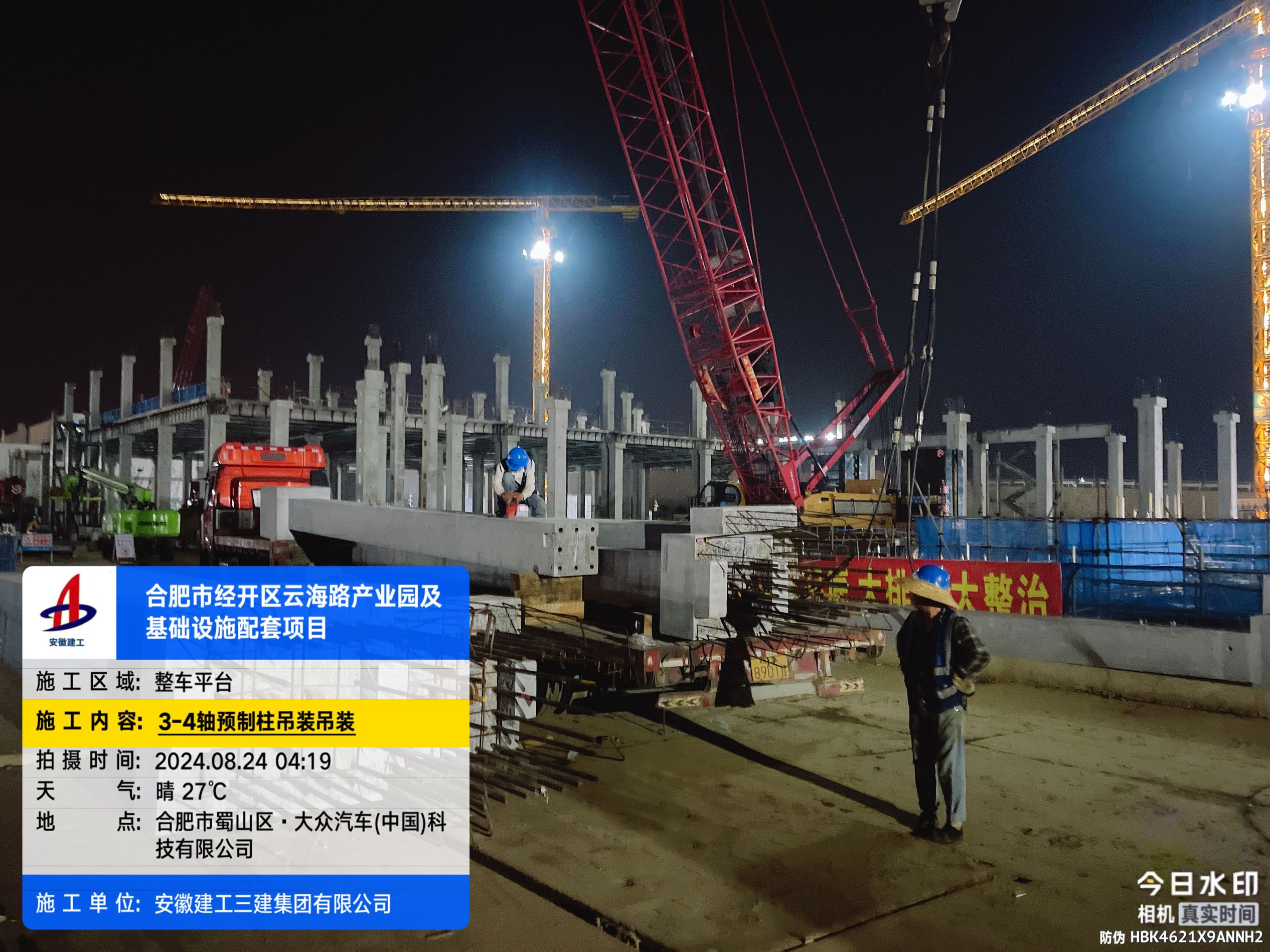 夜色已深,持续的高温依然笼罩着江淮大地。虽然已接近凌晨4点,但在合肥市经开区云海路大众厂房项目部,此时的温度仍然接近30度,而建筑工业公司现场吊装作业班组依然奋斗在一线,披星戴月,鏖战正酣,一片繁忙景象。