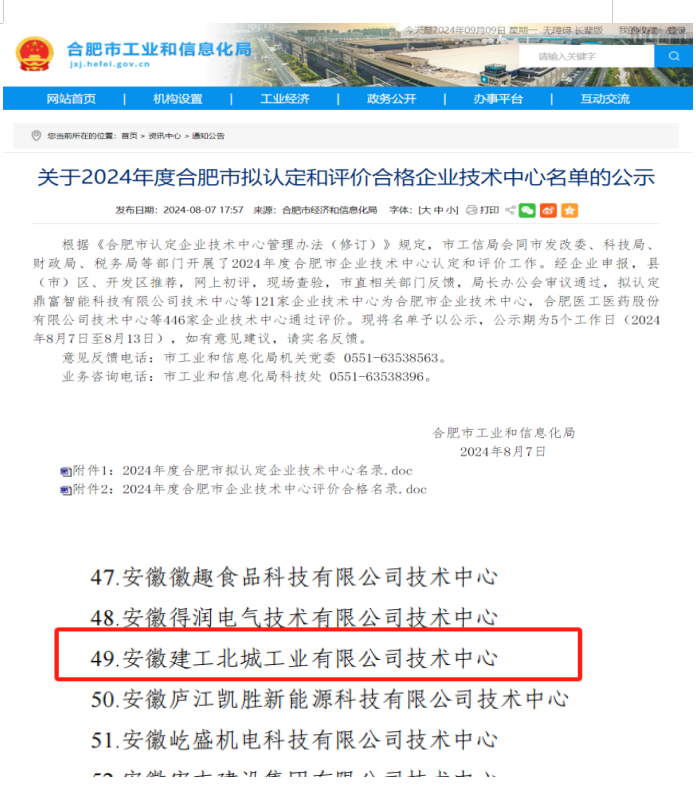 近日,合肥市工业和信息化局发布关于2024年度合肥市拟认定和评价合格企业技术中心名单的公示,北城工业公司申报的“安徽建工北城工业有限公司技术中心”成功入选。