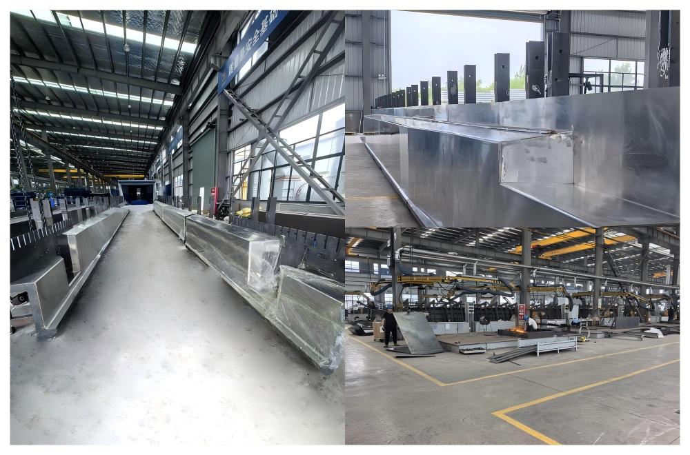 面对诸多挑战,模具模板厂团队深知肩负重任。作为预制桥梁建设的第一道关,预制T梁模具是预制桥梁工程的“基石”,其精度、刚度和耐久性直接决定了桥梁主体的质量与安全。面对本项目T梁结构复杂、设计荷载大、精度要求极高等特点,模具模板厂团队生产施工前召开专项技术交底会,由设计人员交底制作班组图纸学习,掌握熟悉制作关键点与难点。质量管理人员宣贯不锈钢复合钢模板质量控制要点及质量标准,严把质量关。不锈钢复合T梁钢模板材料成本控制难度大,模具模板厂团队从设计源头开始根据图纸设计尺寸计算最为合理板材尺寸后报材料计划,在板材排版切割环节,排版人员精细排版,将不锈钢复合板材损耗率牢牢控制在3%;下料质量对模板整体质量好坏影响最为重要,一是激光下料切割质量(切割误差≤1mm,不得有毛刺飞边,为保护板面不得采用板夹上下料改用吸盘上下料),二是在折弯精度要求先试折比对无误后再进行坯料折弯,每折弯20刀后需进行尺寸对比检查校正,模具模板厂团队严密布置,详细交底折弯工艺细节,迅速抽调精锐力量,组织管理人员发挥“压舱石”作用,积极外出调研技术难点,带领班组明确了技术要点和生产方法。