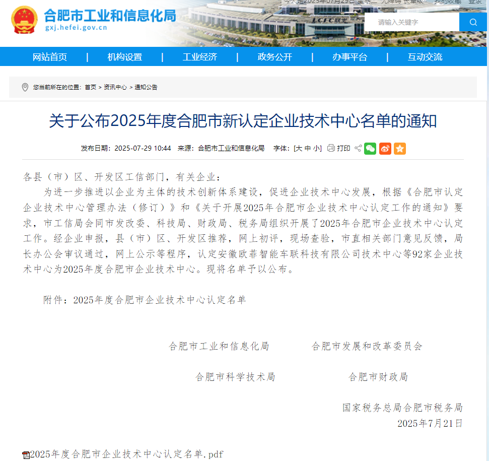 近日,合肥市工业和信息化局官网发布2025年度合肥市新认定企业技术中心名单,中仑公司荣耀登榜。