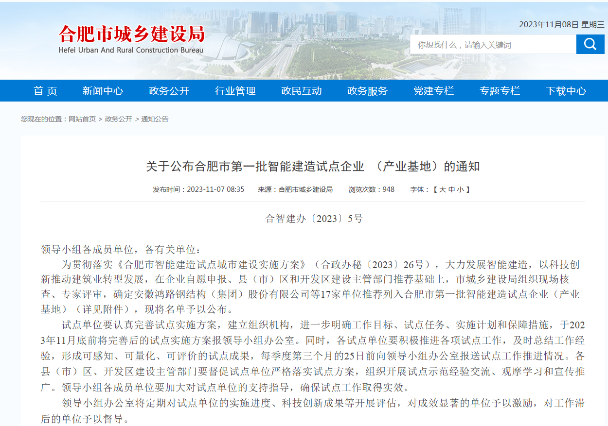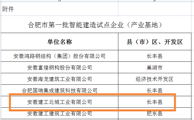 11月7日,合肥市城乡建设局发布的关于公布合肥市第一批智能建造试点企业(产业基地)的名单,建工工业化集团旗下安徽建工北城工业有限公司位列第五。
