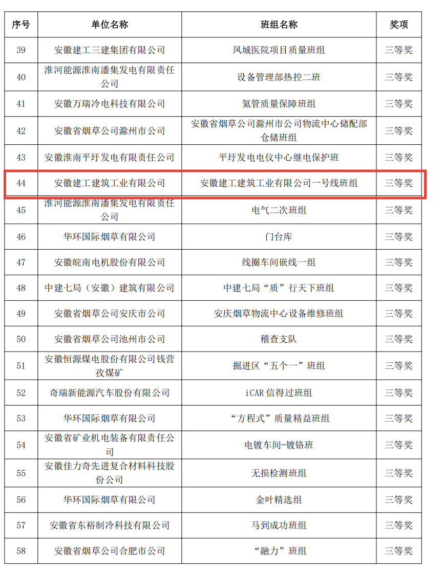喜报!建筑工业公司荣获第五届“安徽省质量创新技能大赛质量信得过班组”三等奖